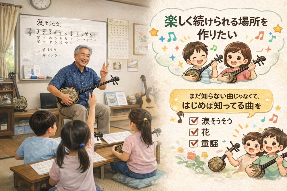 練習曲も難しい沖縄民謡からではなく、「涙そうそう」や「花」、童謡など、子どもたちが「あ、知ってる!」と感じられる曲からスタートします。知っている曲が弾けると、それだけで自信になるんです。